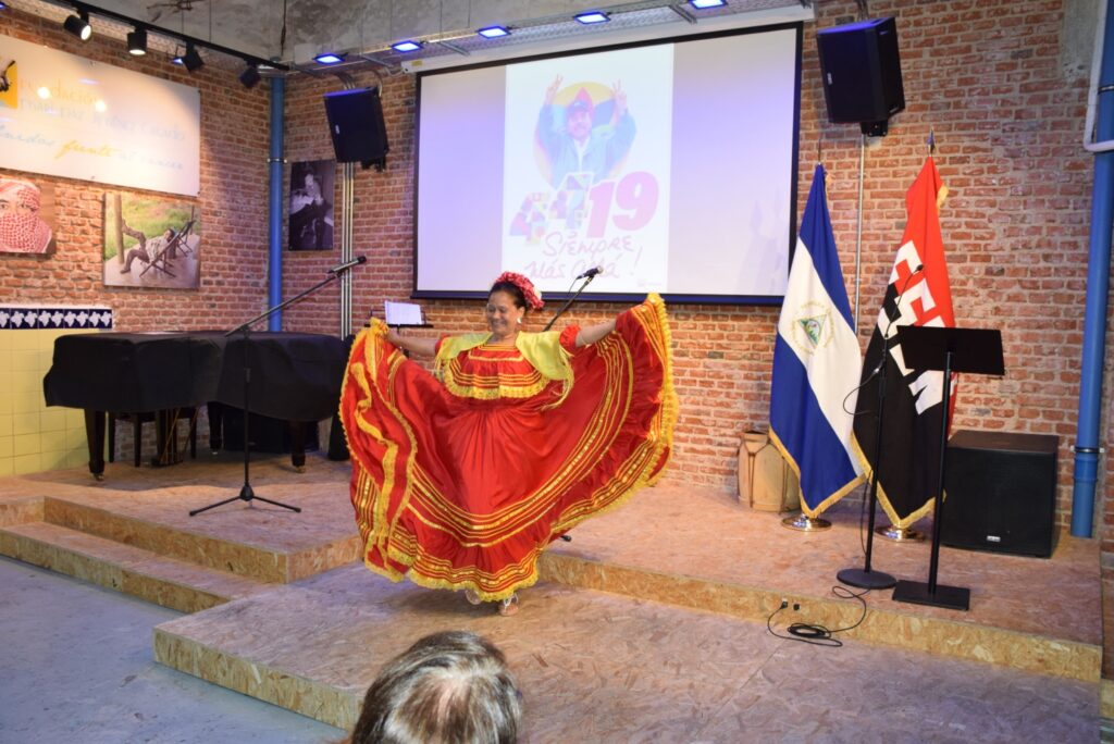 Durante el acto, se transmitieron videos alusivos al Proceso Revolucionario de Nicaragua y hubo intervenciones musicales dedicadas a la Revolución Sandinista en la que participaron Ismael de la Torre, Salvador Amor, Orlis Pineda y Juanjo Anaya. Del mismo modo, se presentaron bailes folclóricos a cargo de compañeras sandinistas radicadas en Madrid.